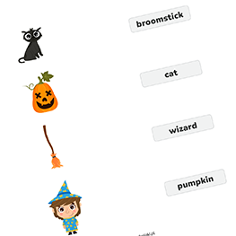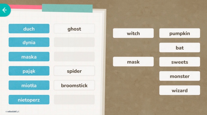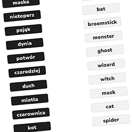 Znam słowa Halloween to edukacyjna zabawa online dla dzieci, w której zadaniem jest połączenie słów angielskich z ich polskimi odpowiednikami. Ta zabawa edukacyjna w ciekawy i interaktywny sposób uczy angielskiego.