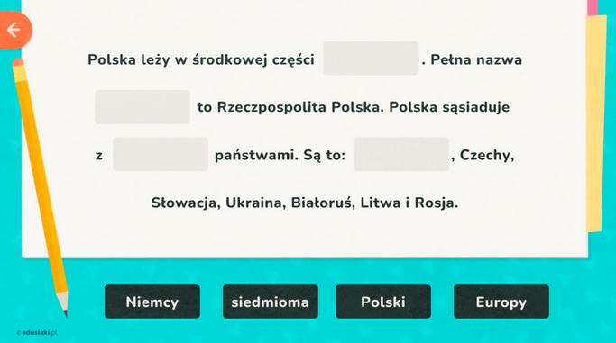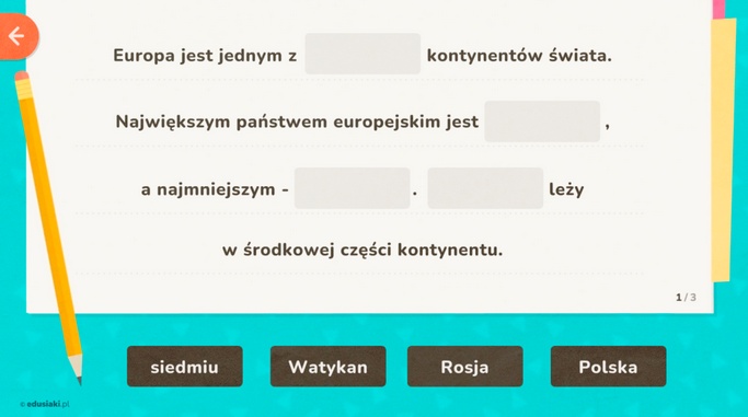 Edusiaki.pl przygotowały dla dzieci grę pt. Europa. W tek grze online zadaniem dziecka jest uzupełnienie informacji, przeciągając właściwe wyrazy w odpowiednie miejsca.