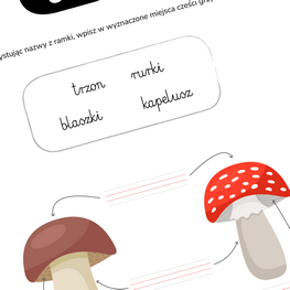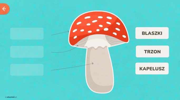 Budowa grzyba to edukacyjna gra dla dzieci, którą można znaleźć na stronie edusiaki.pl. Ta zabawa online uczy dzieci z jakich części składa się grzyb. Wystarczy przeciągnąć podpisy we właściwe miejsca.
