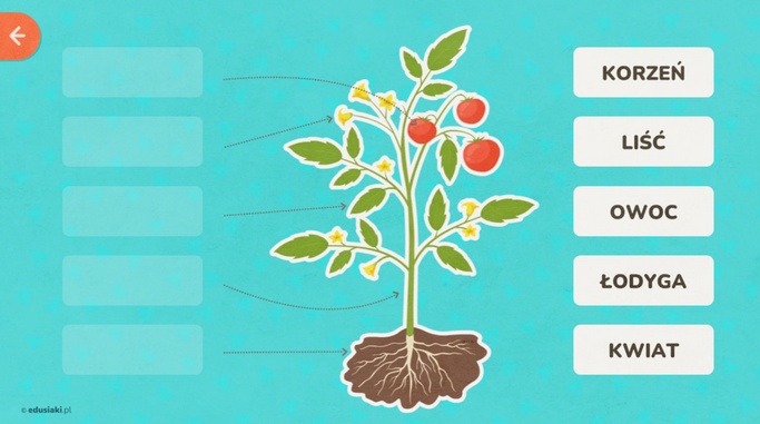 Dzięki grze online na stronie edusiaki.pl dzieci w ciekawy i zabawowy sposób mogą poznać nazwy i wygląd podstawowych części rośliny. Każdy młody gracz może bawić się i uczyć jednocześnie. W prezentowanej grze zadaniem dziecka jest przeciągnięcie nazw części rośliny w odpowiednie miejsca.