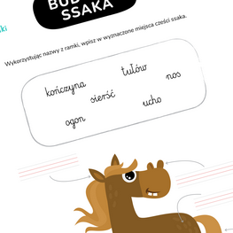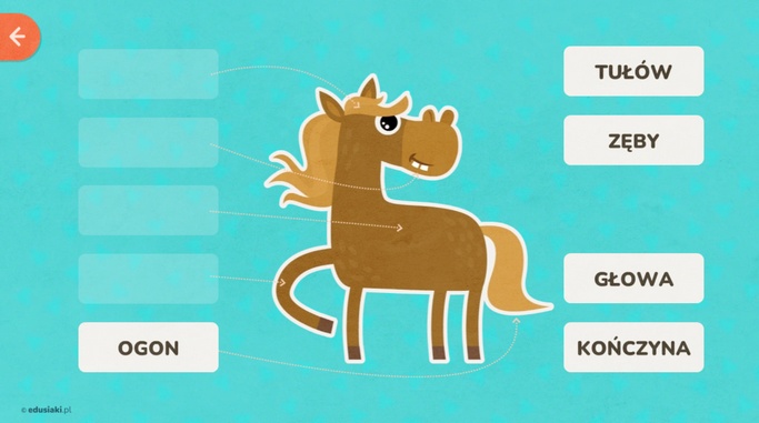Budowa ssaka to edukacyjna gra dla dzieci w wieku wczesnoszkolnym. W tej zabawie zadaniem gracza jest dopasowanie podpisów do części przedstawionego konika.