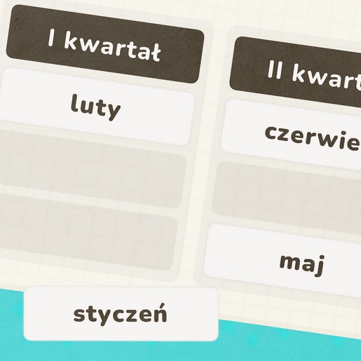 Czy potrafisz przyporządkować miesiące do kwartałów roku? W tej edukacyjnej zabawie dla dzieci należy przyporządkować poszczególne miesiące do odpowiednich kwartałów. Zdobądź wiedzę na temat podziału roku na cztery równomiernie rozłożone części.