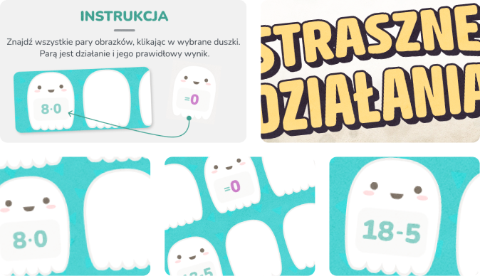 Straszne działania to memo edukacyjne z nutką grozy! Na duszkach znajdują się działania matematyczne, a zadaniem gracza jest odnalezienie dwóch kart – działanie i jego wynik. Gra wspiera naukę liczenia oraz rozwija pamięć, dostarczając jednocześnie mnóstwa zabawy. Idealna na Halloween i nie tylko!