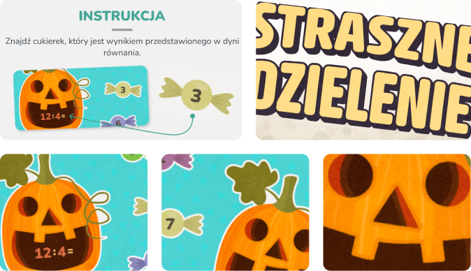 W grze dzieci rozwiązują zagadki matematyczne, pomagając dyni w obliczeniach! Na ekranie pojawia się dynia z działaniem na dzielenie, a gracz musi dopasować do niej cukierek z prawidłowym wynikiem. Zabawa z cukierkami to idealny sposób na naukę matematyki w strasznie fajny sposób!